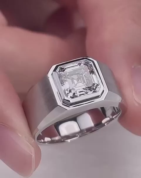 Bold and brilliant, this men's ring features a stunning Asscher cut diamond set in a sleek platinum band. The step-cut facets radiate clarity and confidence, making it an iconic piece for the modern gentleman.