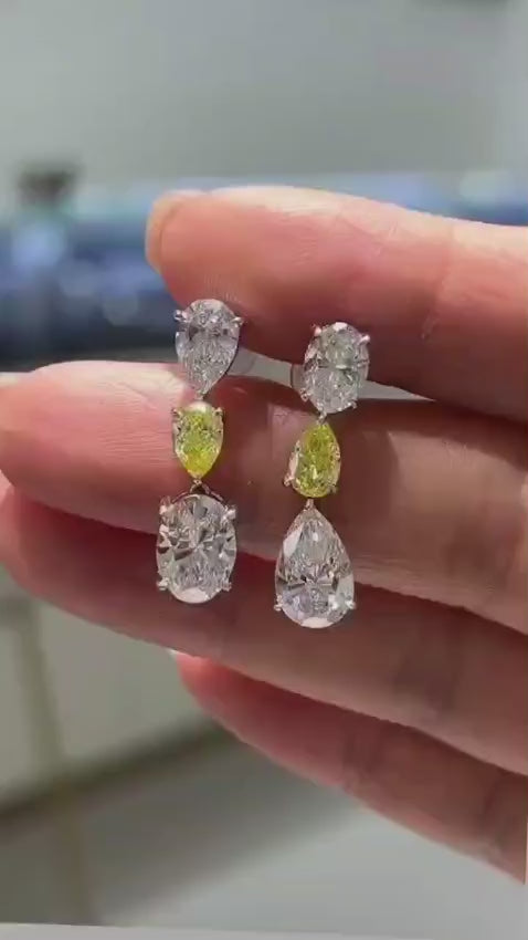 These stunning earrings feature a luxurious combination of fancy yellow pear-cut diamonds and dazzling white diamonds in pear and oval shapes. Set in white gold, they are perfect for formal occasions and red carpet glamour.